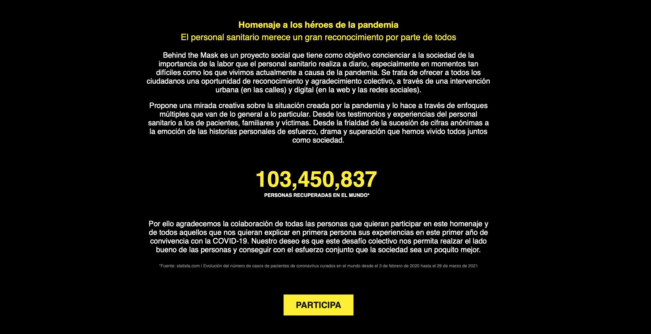 Referente a la parte digital, cada una de las imágenes lleva un código QR identificativo único que enlaza la imagen con la plataforma web que se ha creado para el proyecto (www.behindthemask.es), desvelando la identidad y la historia de la persona detrás de la mascarilla.