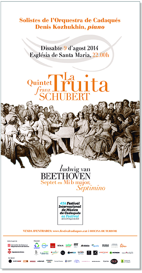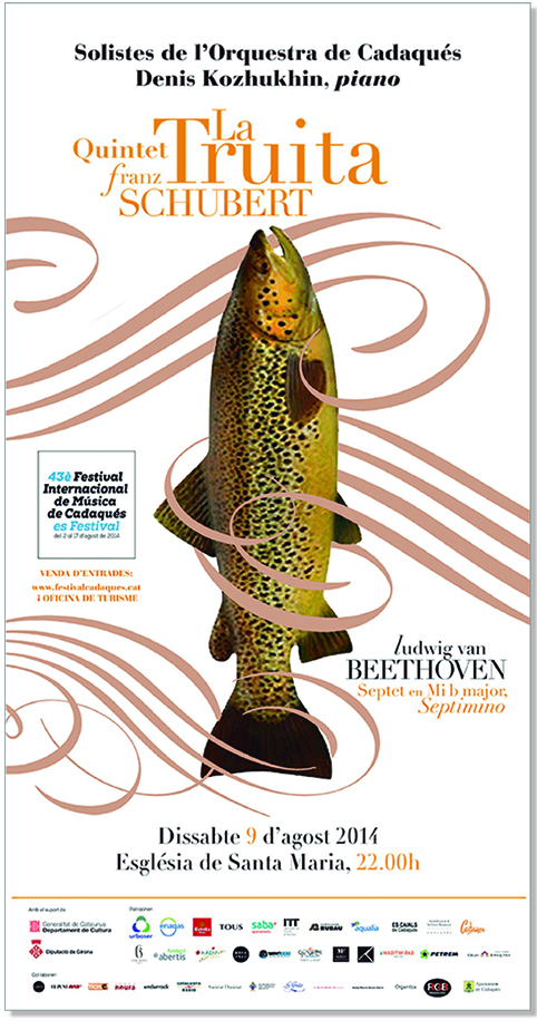 Este verano hemos diseñado dos carteles para el quinteto de La Trucha de Schubert, interpretada por los solistas de la Orquestra de Cadaqués el pasado nueve de agosto dentro del 43º Festival de Música de Cadaqués.